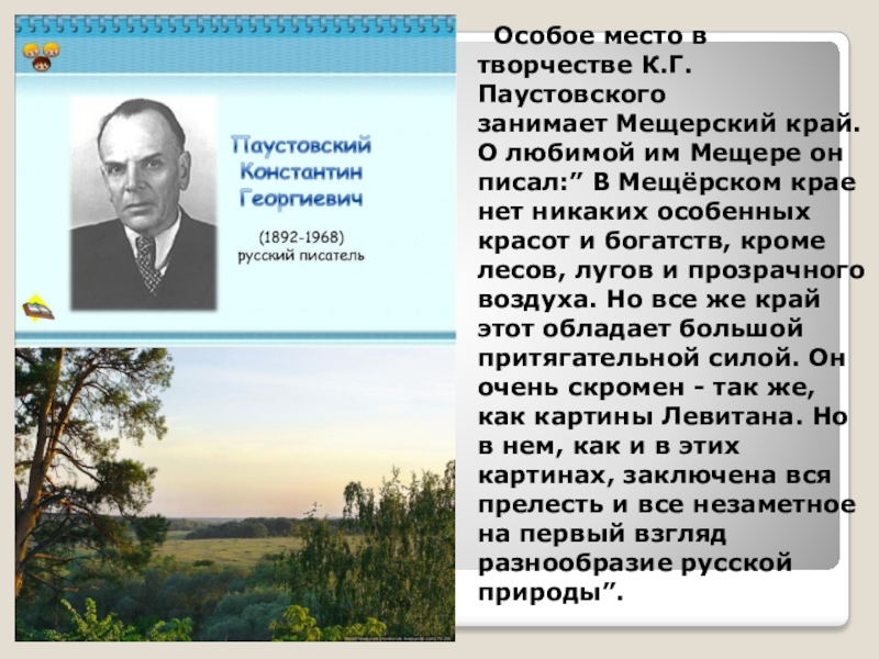 Особое место в творчестве К.Г.Паустовского занимает Мещерский край. О любимой им