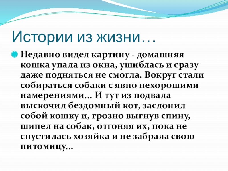ушиблась и сразу даже подняться не смогла. Вокруг стали собираться собаки с явно нехорошими намерениями... И тут из подвала выскочил бездомный кот, заслонил собой кошку и, грозно выгнув спину, шипел на собак, отгоняя их, пока не спустилась хозяйка и не забрала свою питомицу...