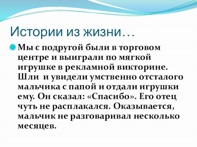 по мягкой игрушке в рекламной викторине. Шли и увидели умственно отсталого мальчика с папой и отдали игрушки ему. Он сказал: «Спасибо». Его отец чуть не расплакался. Оказывается, мальчик не разговаривал несколько месяцев.