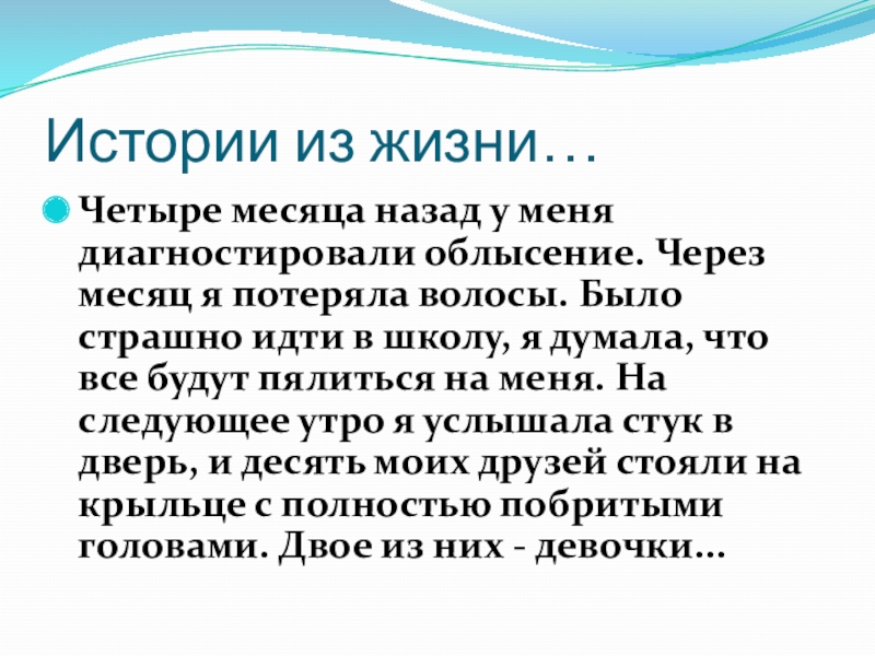 я потеряла волосы. Было страшно идти в школу, я думала, что все будут пялиться на меня. На следующее утро я услышала стук в дверь, и десять моих друзей стояли на крыльце с полностью побритыми головами. Двое из них - девочки...