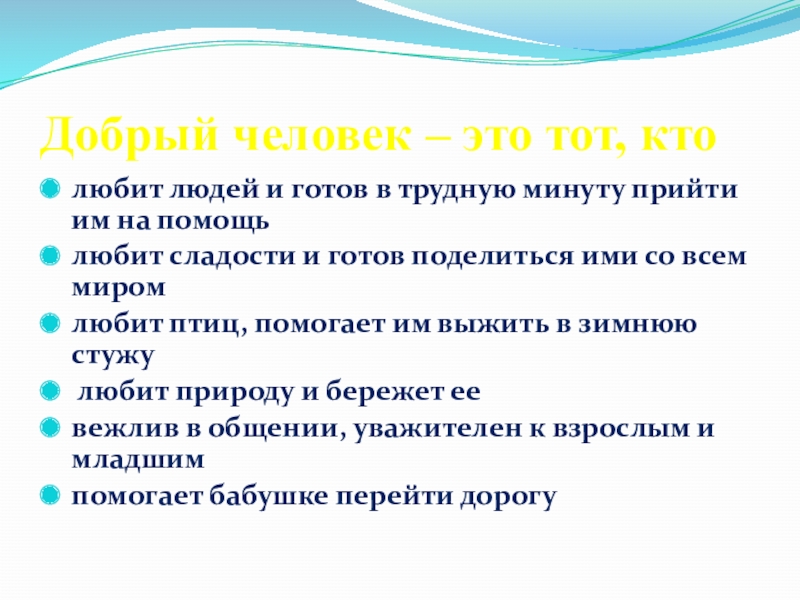 Добрый человек – это тот, кто любит людей и готов в трудную минуту прийти им на помощь