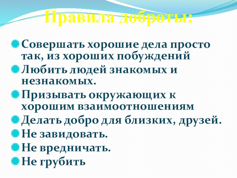 Правила доброты: Совершать хорошие дела просто так, из хороших побужденийЛюбить людей знакомых и незнакомых.Призывать окружающих к хорошим
