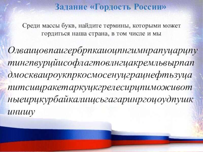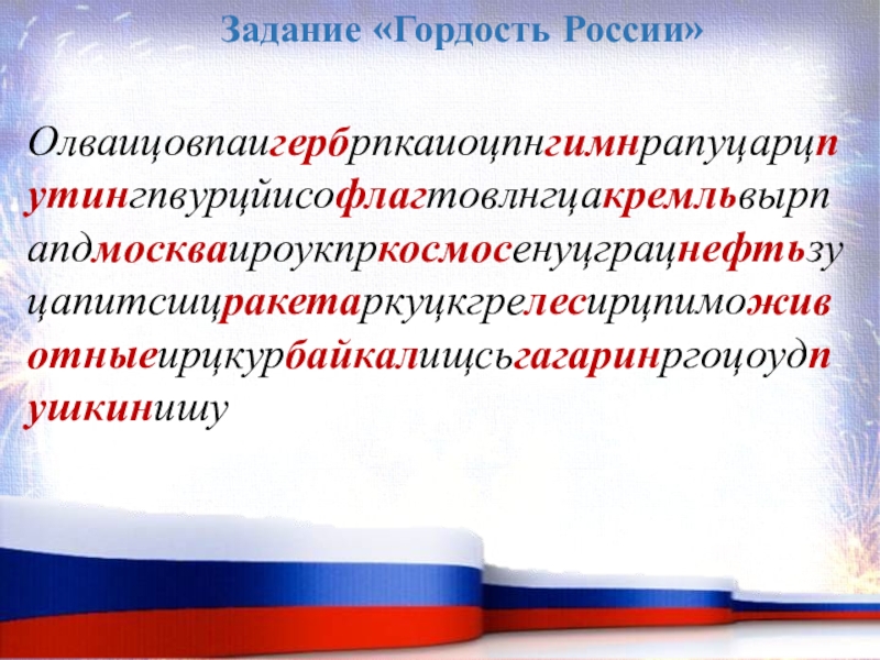 Задание «Гордость России»Олваицовпаигербрпкаиоцпнгимнрапуцарцпутингпвурцйисофлагтовлнгцакремльвырпапдмоскваироукпркосмосенуцграцнефтьзуцапитсшцракетаркуцкгрелесирцпиможивотныеирцкурбайкалищсьгагаринргоцоудпушкинишу