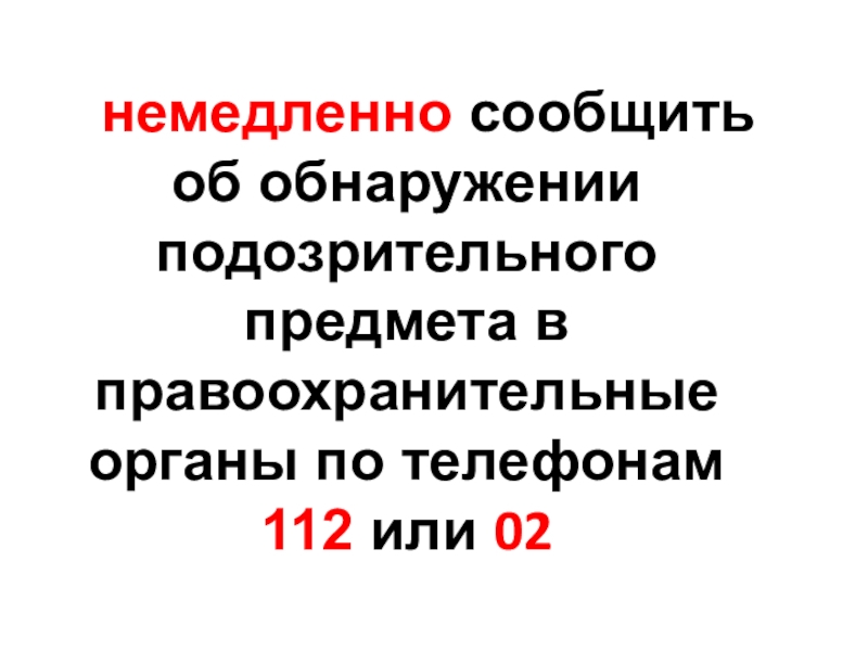 Слайд 22немедленно сообщить об обнаружении подозрительного предмета в правоохранительные органы по телефонам