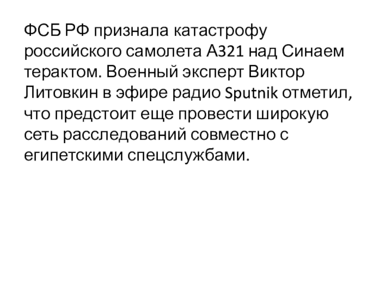 Слайд 4ФСБ РФ признала катастрофу российского самолета А321 над Синаем терактом. Военный