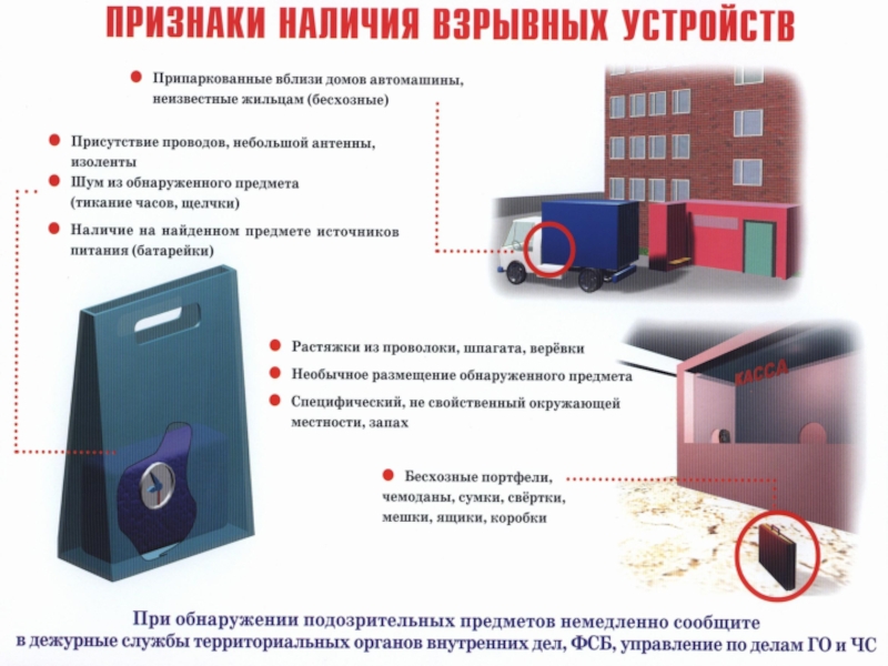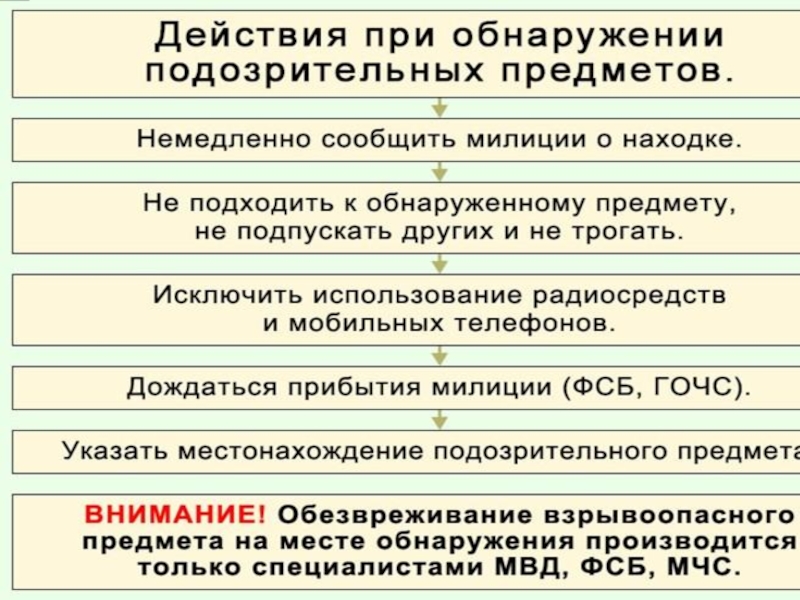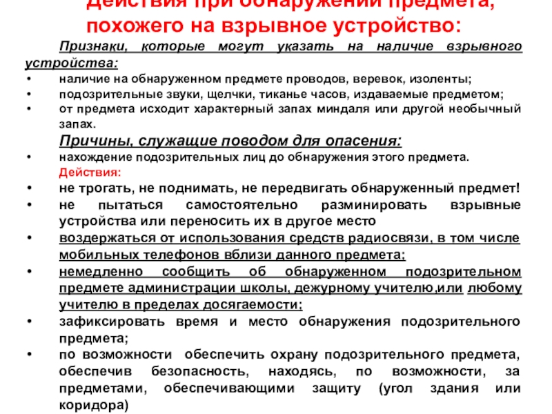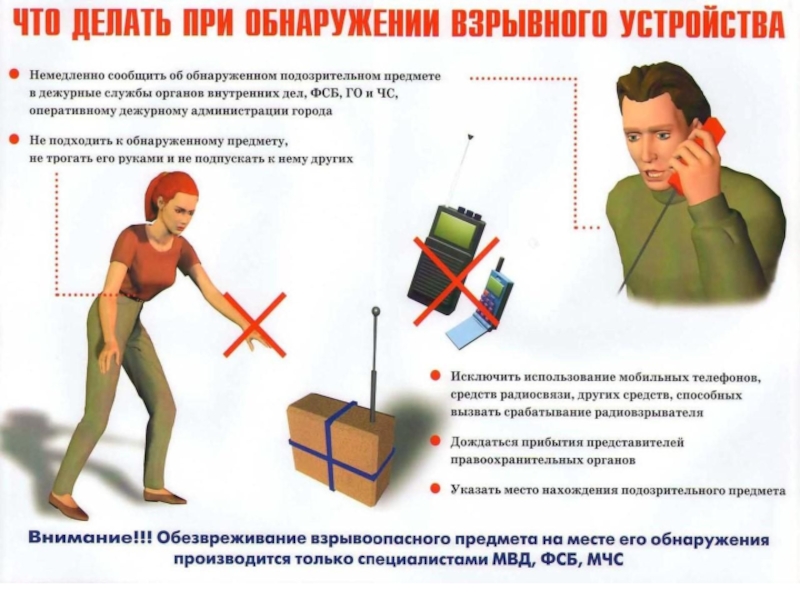 Слайд 14Действия при обнаружении предмета, похожего на взрывное устройство: