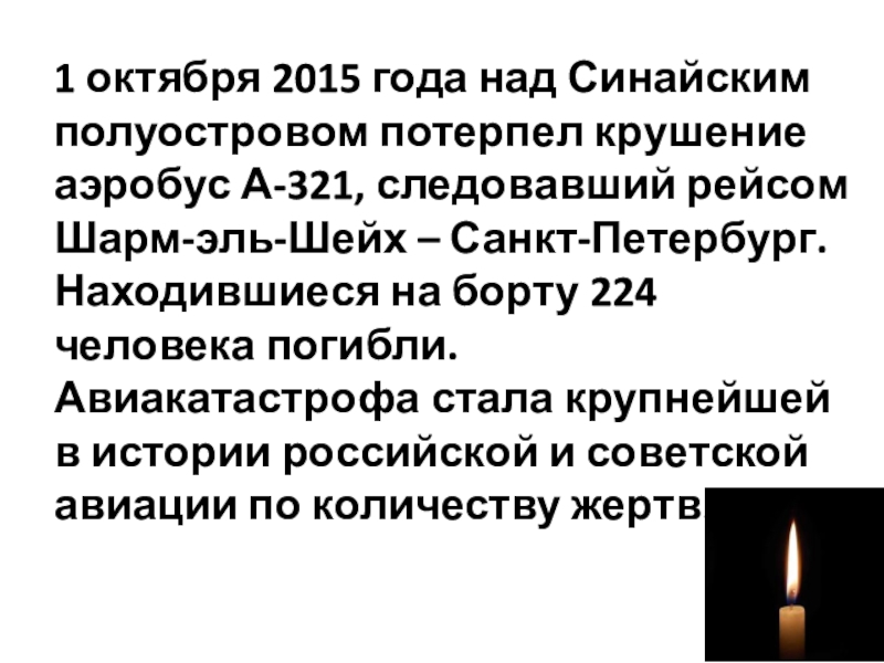 Слайд 31 октября 2015 года над Синайским полуостровом потерпел крушение аэробус А-321,