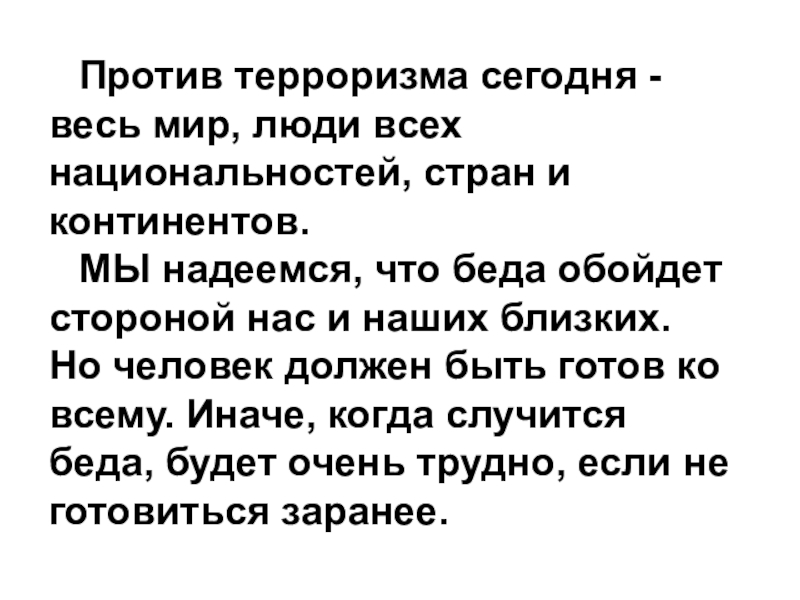 МЫ надеемся, что беда обойдет стороной нас и наших близких. Но человек должен быть готов ко всему. Иначе, когда случится беда, будет очень трудно, если не готовиться заранее.