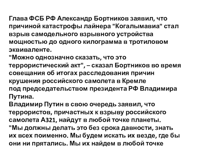Слайд 5Глава ФСБ РФ Александр Бортников заявил, что причиной катастрофы лайнера "Когалымавиа"