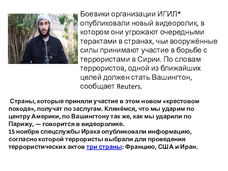 терактами в странах, чьи вооружённые силы принимают участие в борьбе с террористами в Сирии. По словам террористов, одной из ближайших целей должен стать Вашингтон, сообщает Reuters.