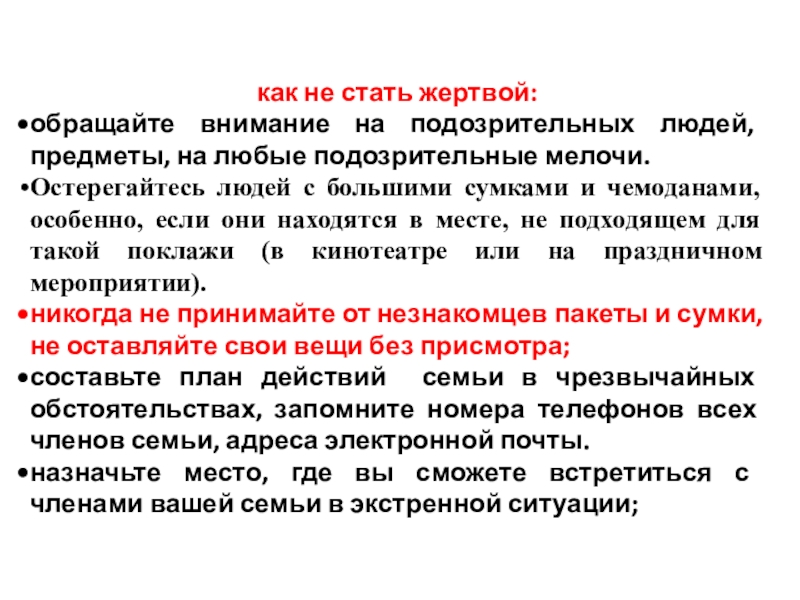 никогда не принимайте от незнакомцев пакеты и сумки, не оставляйте свои вещи без присмотра;