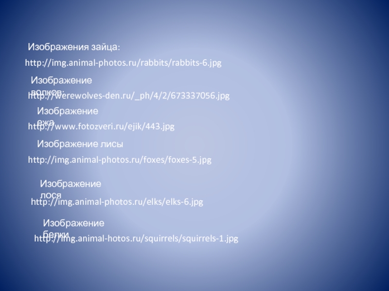 Изображения зайца:Изображение волков:Изображение ежаИзображение лисыИзображение лосяИзображение белкиhttp://img.animal-photos.ru/foxes/foxes-5.jpghttp://img.animal-hotos.ru/squirrels/squirrels-1.jpghttp://img.animal-photos.ru/rabbits/rabbits-6.jpghttp://img.animal-photos.ru/elks/elks-6.jpghttp://werewolves-den.ru/_ph/4/2/673337056.jpghttp://www.fotozveri.ru/ejik/443.jpg