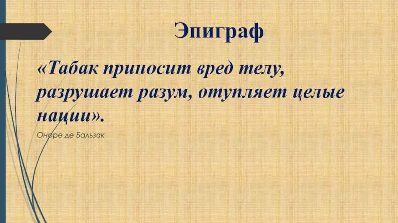 Эпиграф «Табак приносит вред телу, разрушает разум, отупляет целые нации». Оноре де Бальзак
