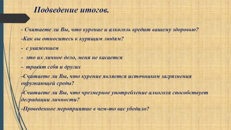 Подведение итогов.- Считаете ли Вы, что курение и алкоголь вредит вашему здоровью?-Как вы относитесь к курящим людям?-