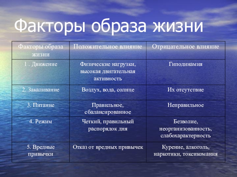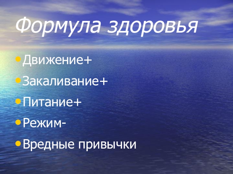 Формула здоровьяДвижение+Закаливание+Питание+Режим-Вредные привычки