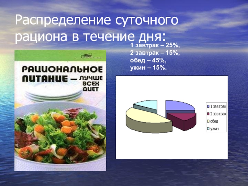 Распределение суточного рациона в течение дня:1 завтрак – 25%, 2 завтрак – 15%,обед – 45%,  ужин