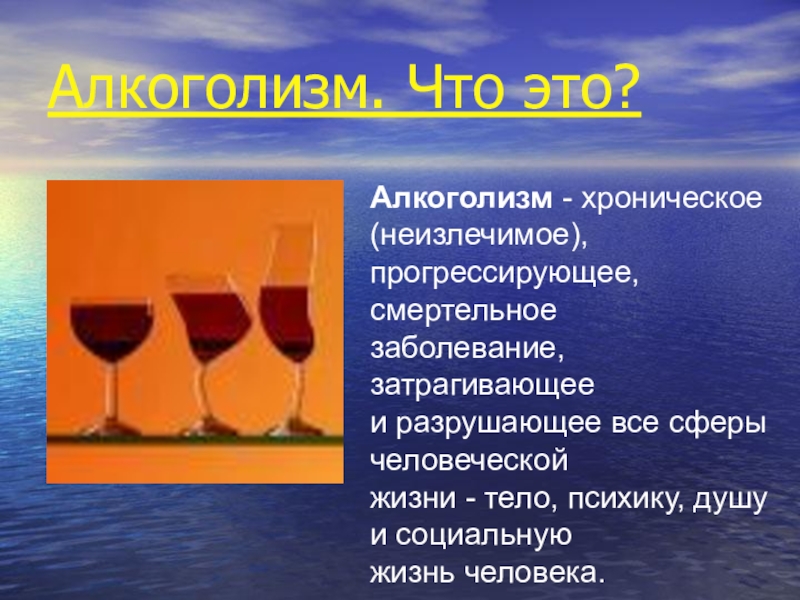 Алкоголизм. Что это?Алкоголизм - хроническое (неизлечимое),прогрессирующее, смертельное заболевание, затрагивающее и разрушающее все сферы человеческойжизни - тело, психику,