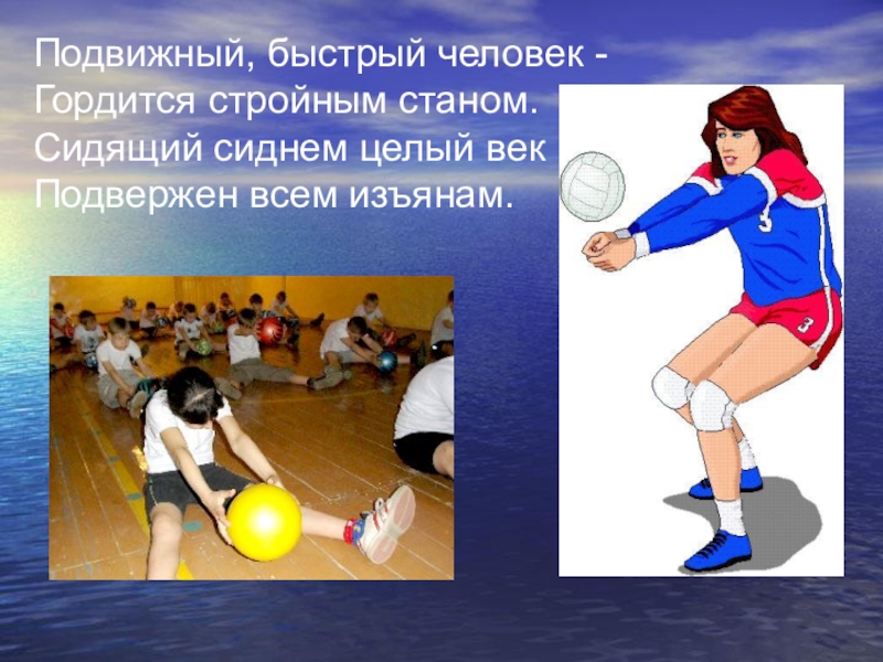 Слайд 7Подвижный, быстрый человек - Гордится стройным станом. Сидящий сиднем целый век Подвержен всем изъянам.