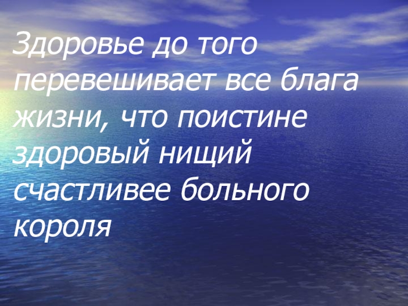 Слайд 3Здоровье до того перевешивает все блага жизни, что поистине здоровый нищий