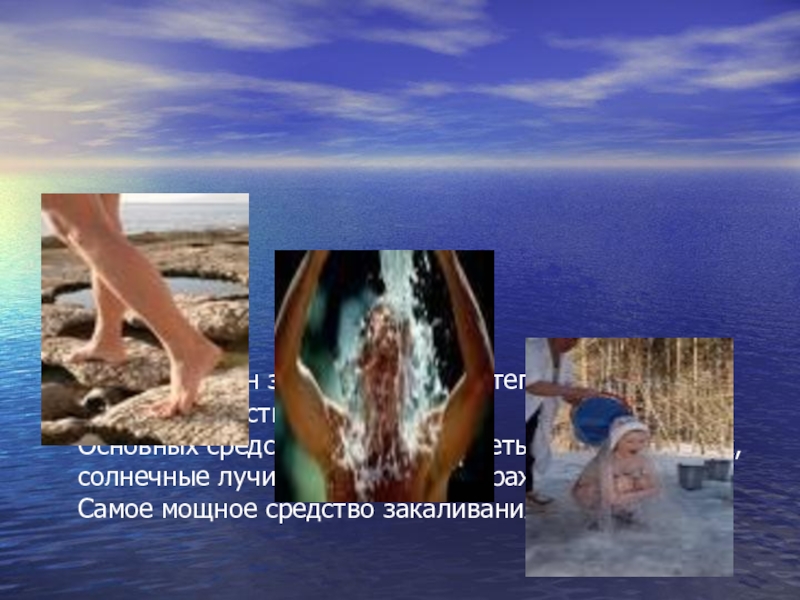 Слайд 8Главный закон закаливания - постепенность и систематичность. Основных средств закаливания четыре: