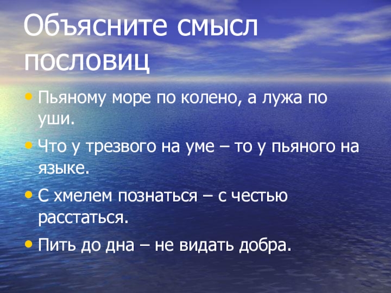 Объясните смысл пословицПьяному море по колено, а лужа по уши. Что у трезвого на уме – то