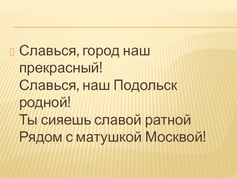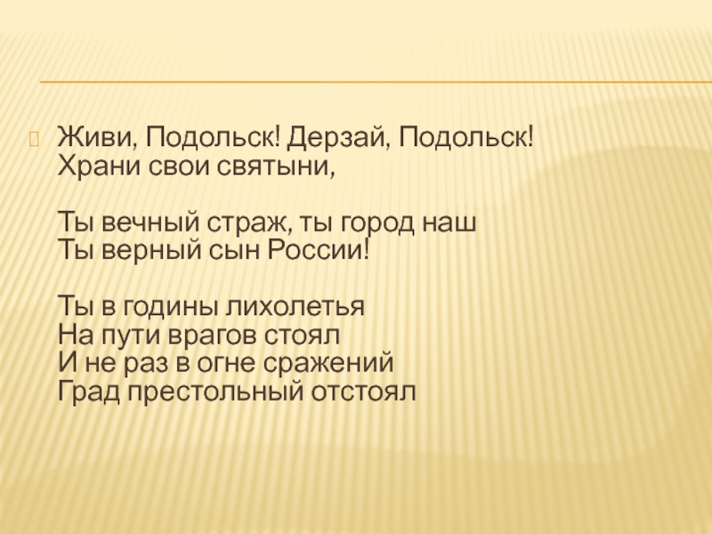 Живи, Подольск! Дерзай, Подольск!  Храни свои святыни,   Ты вечный страж, ты город наш