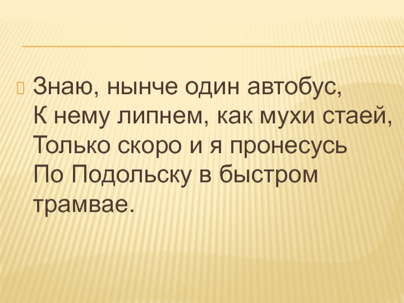Слайд 9Знаю, нынче один автобус, К нему липнем, как мухи стаей, Только