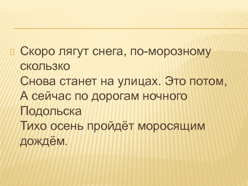 Слайд 11Скоро лягут снега, по-морозному скользко Снова станет на улицах. Это потом, А сейчас
