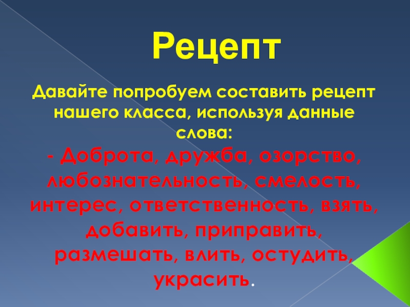 озорство, любознательность, смелость, интерес, ответственность, взять, добавить, приправить, размешать, влить, остудить, украсить.