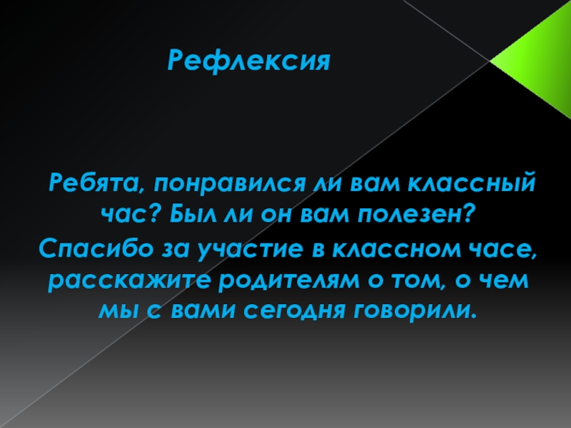 Спасибо за участие в классном часе, расскажите родителям о том, о чем мы с вами сегодня говорили.