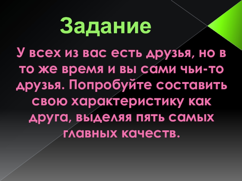 и вы сами чьи-то друзья. Попробуйте составить свою характеристику как друга, выделяя пять самых главных качеств.