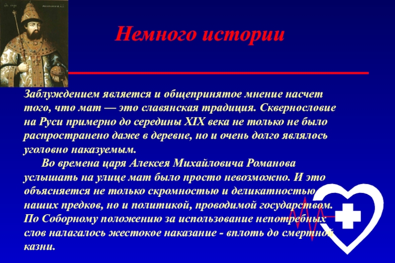 Во времена царя Алексея Михайловича Романова услышать на улице мат было просто невозможно. И это объясняется не только скромностью и деликатностью наших предков, но и политикой, проводимой государством. По Соборному положению за использование непотребных слов налагалось жестокое наказание - вплоть до смертной казни.