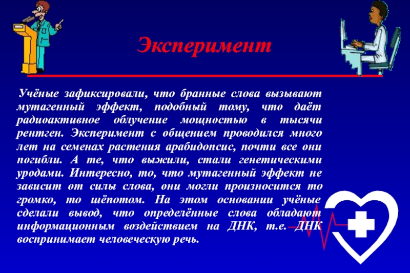 тому, что даёт радиоактивное облучение мощностью в тысячи рентген. Эксперимент с общением проводился много лет на семенах растения арабидопсис, почти все они погибли. А те, что выжили, стали генетическими уродами. Интересно, то, что мутагенный эффект не зависит от силы слова, они могли произносится то громко, то шёпотом. На этом основании учёные сделали вывод, что определённые слова обладают информационным воздействием на ДНК, т.е. ДНК воспринимает человеческую речь.