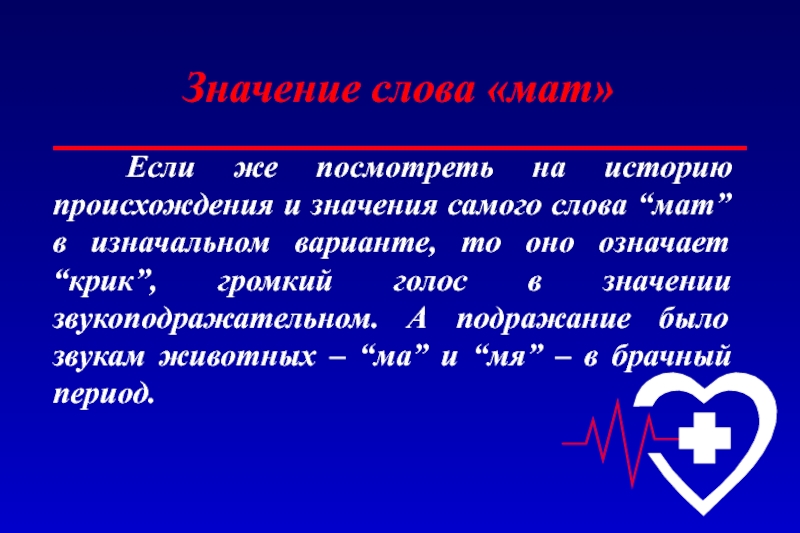 значения самого слова “мат” в изначальном варианте, то оно означает “крик”, громкий голос в значении звукоподражательном. А подражание было звукам животных – “ма” и “мя” – в брачный период.