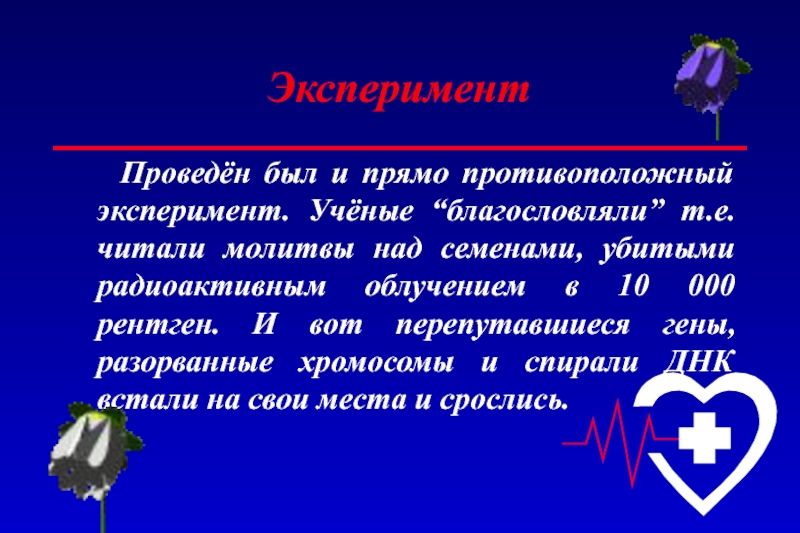 читали молитвы над семенами, убитыми радиоактивным облучением в 10 000 рентген. И вот перепутавшиеся гены, разорванные хромосомы и спирали ДНК встали на свои места и срослись.