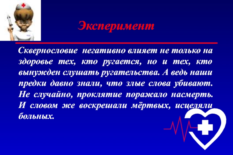 ругается, но и тех, кто вынужден слушать ругательства. А ведь наши предки давно знали, что злые слова убивают. Не случайно, проклятие поражало насмерть. И словом же воскрешали мёртвых, исцеляли больных.