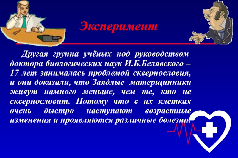 – 17 лет занималась проблемой сквернословия, и они доказали, что Заядлые матерщинники живут намного меньше, чем те, кто не сквернословит. Потому что в их клетках очень быстро наступают возрастные изменения и проявляются различные болезни.