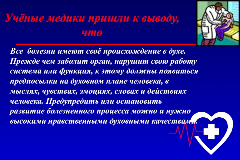 происхождение в духе. Прежде чем заболит орган, нарушит свою работу система или функция, к этому должны появиться предпосылки на духовном плане человека, в мыслях, чувствах, эмоциях, словах и действиях человека. Предупредить или остановить развитие болезненного процесса можно и нужно высокими нравственными духовными качествами.