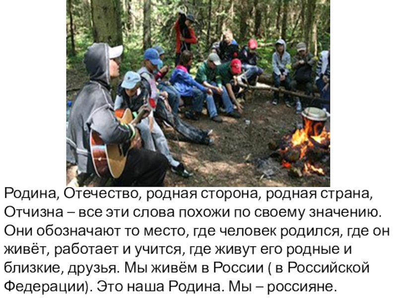 похожи по своему значению. Они обозначают то место, где человек родился, где он живёт, работает и учится, где живут его родные и близкие, друзья. Мы живём в России ( в Российской Федерации). Это наша Родина. Мы – россияне.