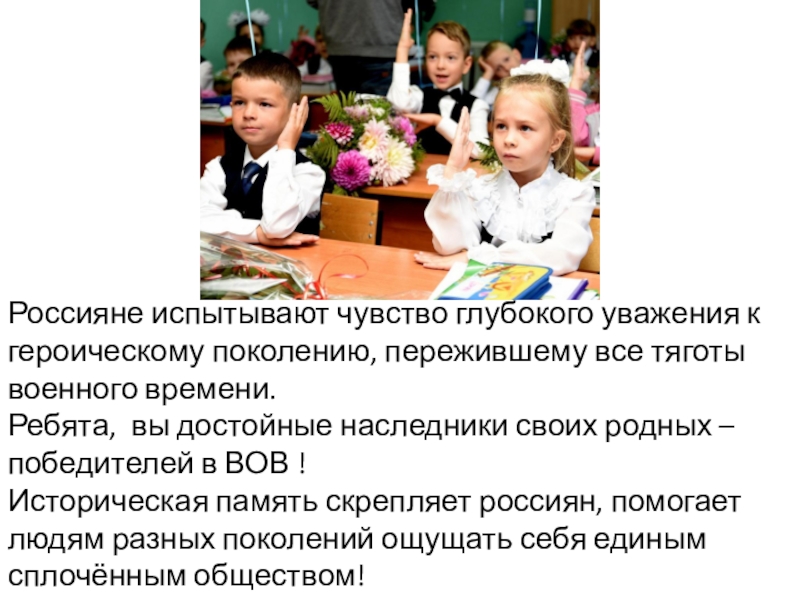 Слайд 17Россияне испытывают чувство глубокого уважения к героическому поколению, пережившему все тяготы