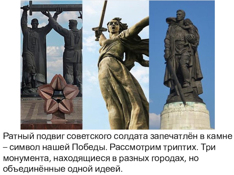 Слайд 9Ратный подвиг советского солдата запечатлён в камне – символ нашей Победы. Рассмотрим