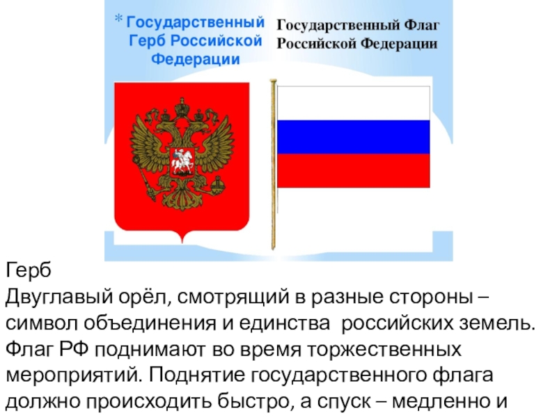 Флаг РФ поднимают во время торжественных мероприятий. Поднятие государственного флага должно происходить быстро, а спуск – медленно и торжественно.