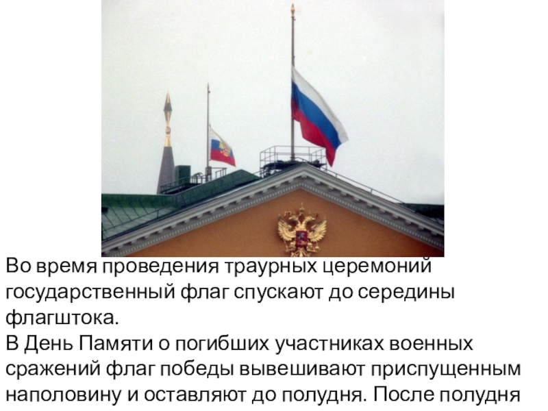 Слайд 7Во время проведения траурных церемоний государственный флаг спускают до середины флагштока.