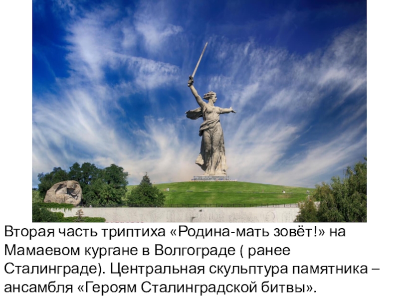 Слайд 11Вторая часть триптиха «Родина-мать зовёт!» на Мамаевом кургане в Волгограде (