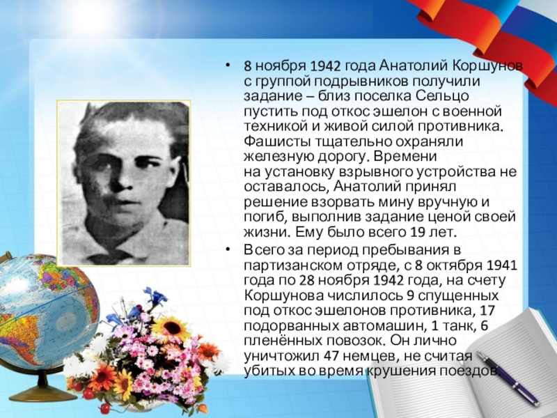 Слайд 108 ноября 1942 года Анатолий Коршунов с группой подрывников получили задание –