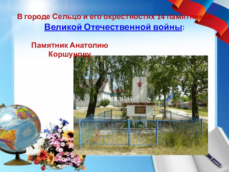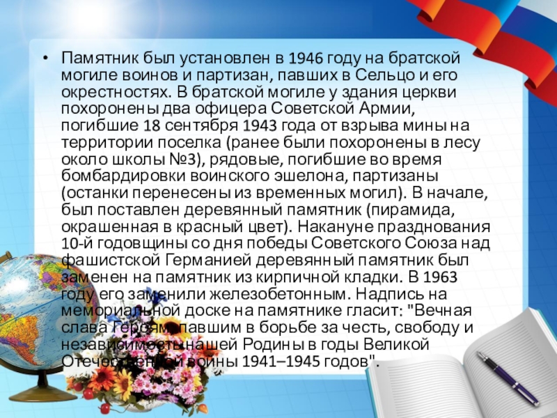 Слайд 16Памятник был установлен в 1946 году на братской могиле воинов и