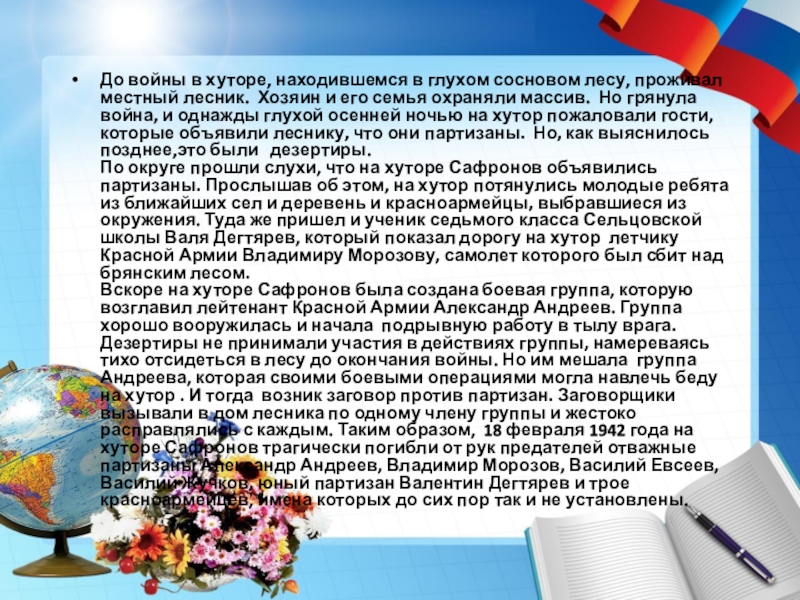 Слайд 23До войны в хуторе, находившемся в глухом сосновом лесу, проживал местный