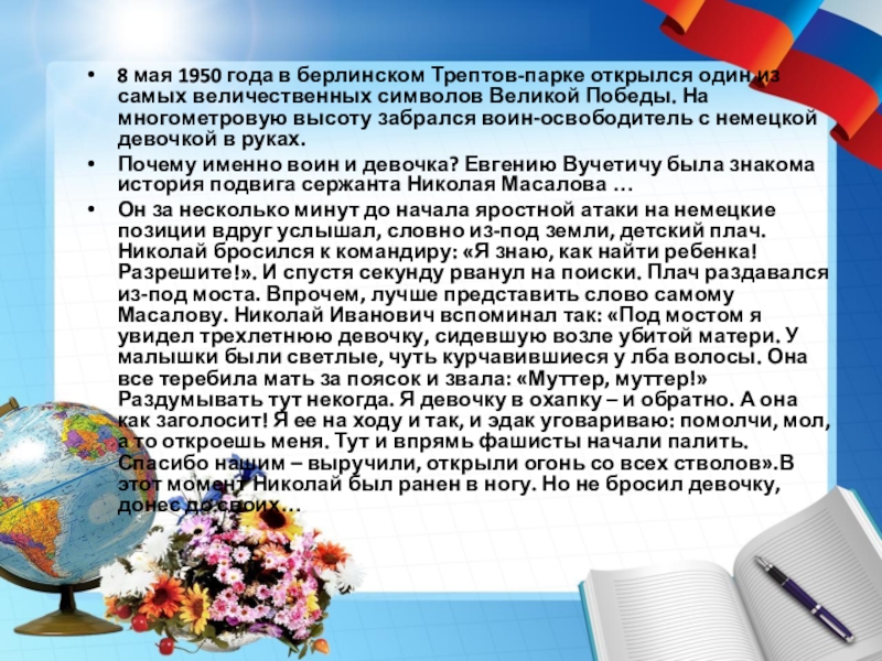 Слайд 88 мая 1950 года в берлинском Трептов-парке открылся один из самых