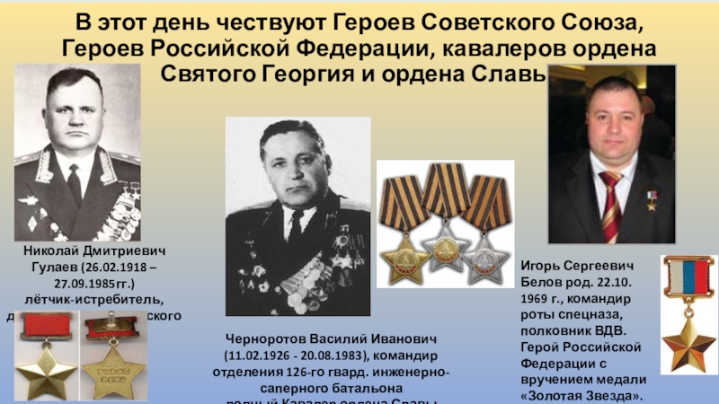 Игорь Сергеевич Белов род. 22.10. 1969 г., командир роты спецназа, полковник ВДВ. Герой Российской Федерации с вручением медали «Золотая Звезда».