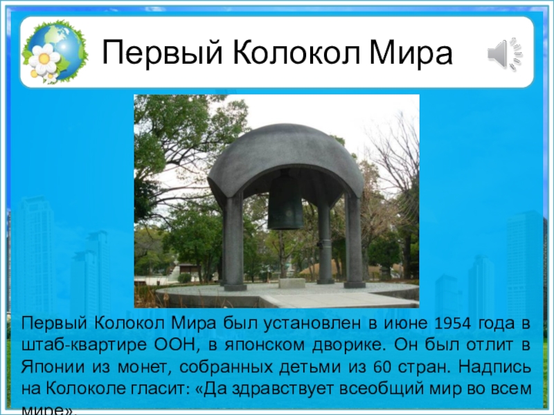 Первый Колокол МираПервый Колокол Мира был установлен в июне 1954 года в штаб-квартире ООН, в японском дворике.